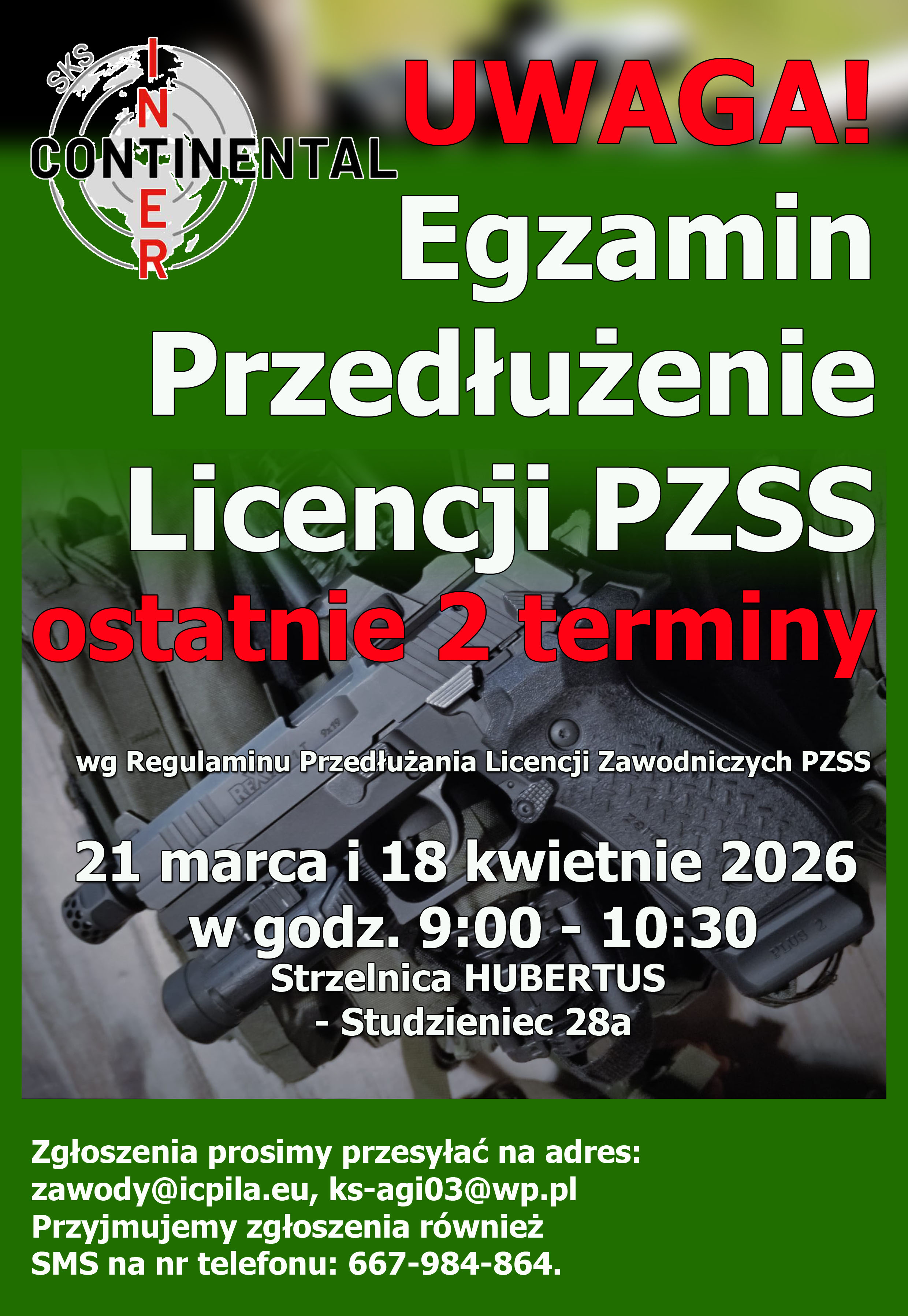 18 kwietnia 2026 r. na strzelnicy HUBERTUS w Chodzieży odbędą się kolejne zawody strzeleckie WZSS organizowane przez Strzelecki Klub Sportowy „Inter-Continental” Piła. W programie rywalizacja w konkurencjach kulowych - karabin i pistolet bocznego oraz centralnego zapłonu - a także strzelba gładkolufowa „trap” i konkurencja dynamiczna. To świetna okazja do sportowej rywalizacji, realizacji wymogów licencyjnych PZSS, zdobywania odznak strzeleckich oraz walki o puchary i dyplomy. Zawody mają charakter otwarty dla zawodników z licencją PZSS, a liczba miejsc jest ograniczona do 80 osób — decyduje kolejność zgłoszeń przesłanych na adres: