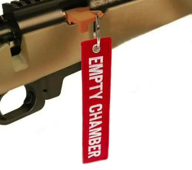 Flaga bezpieczeństwa (safety flag) to prosty, ale kluczowy element, który sygnalizuje, że broń została rozładowana i jest bezpieczna. Wkładamy ją do komory nabojowej lub lufy, gdy odkładamy broń na stanowisku czy stoliku.